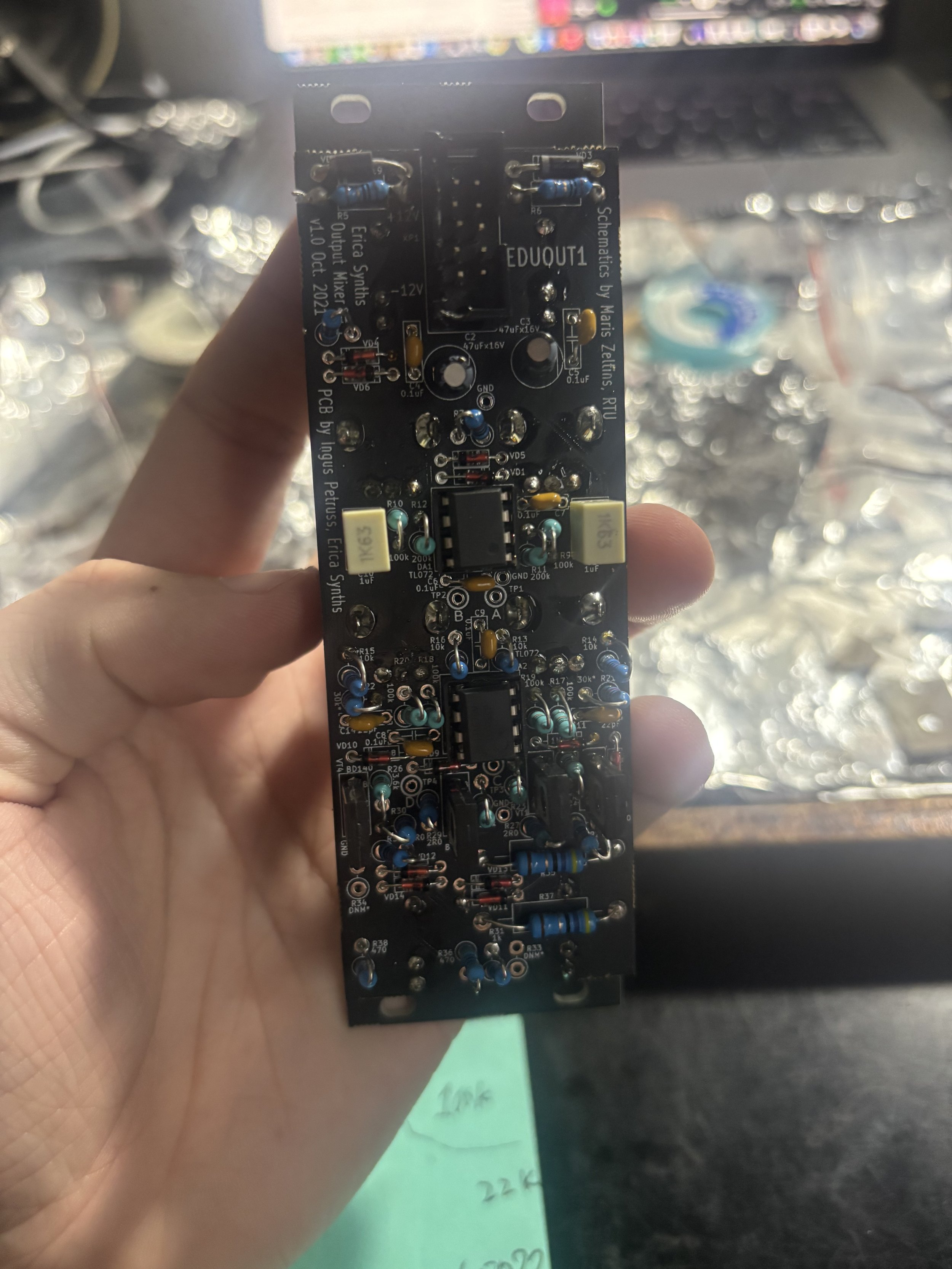 Hand-built Eurorack-format VCO and VCF modules from schematics, including component selection, circuit layout, and calibration